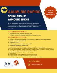 The Big Rapids branch of the American Association of University Women (AAUW) seeks applications for its annual scholarships for students pursuing full-time undergraduate study at Ferris State University. Three students will receive $2000 awards for spring semester 2026. Scholarship awards are paid directly to recipients. Download award criteria and application form here.
