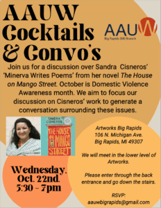 To prepare for this session of Cocktails & Convos, we invite you to read Sandra Cisneros’ “Minerva Writes Poems,” a very brief vignette from her novel, The House on Mango Street. Copies will also be available at the gathering. It’s a really short piece, so you’ll be able to read it then if you don’t find time in advance. We will divide into small groups to discuss the reading. (Be assured you don’t need to read the whole book.)