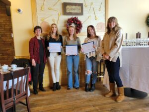 The food was fabulous as usual at Pere Marquette Bistro and Catering for the occasion of our annual holiday luncheon and scholarship presentations. Pictured below are branch president, Leah Monger; scholarship recipient Christina Mayer, a senior in Ferris’ business administration program; Abbigail Hildebrant, a junior in the heavy equipment program and recipient of the inaugural Millie Gillies scholarship; Paiten Frey, a student in the dental hygiene program and recipient of the Geri Hurt scholarship; and Sarah Lucas, chair of the branch scholarship committee. Each student received $2000 to help pay their expenses in the spring 2026 semester. Congratulations to the scholarship recipients, and many thanks to Sarah and members of the scholarship committee for their excellent work!